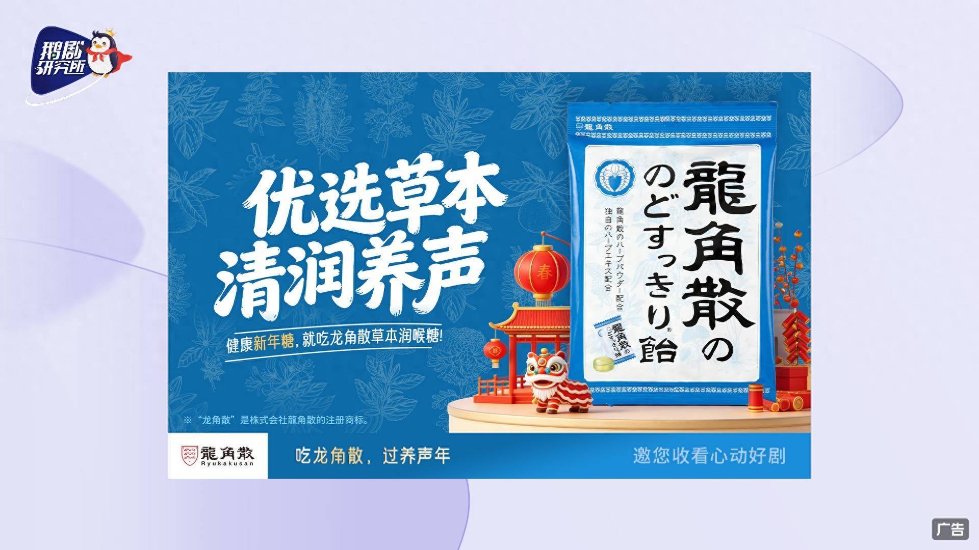 龙角散精准捕捉用户春节期间长时间用嗓、熬夜追剧导致咽喉不适这一痛点,精准覆盖腾讯视频春节档期的热门剧集,通过多元化的广告形式,将品牌信息深度植入用户观剧路径,以“健康新年糖,就吃龙角散”“换季享清润,就吃龙角散”等场景化设定,将产品功能与春节及换季场景强绑定。