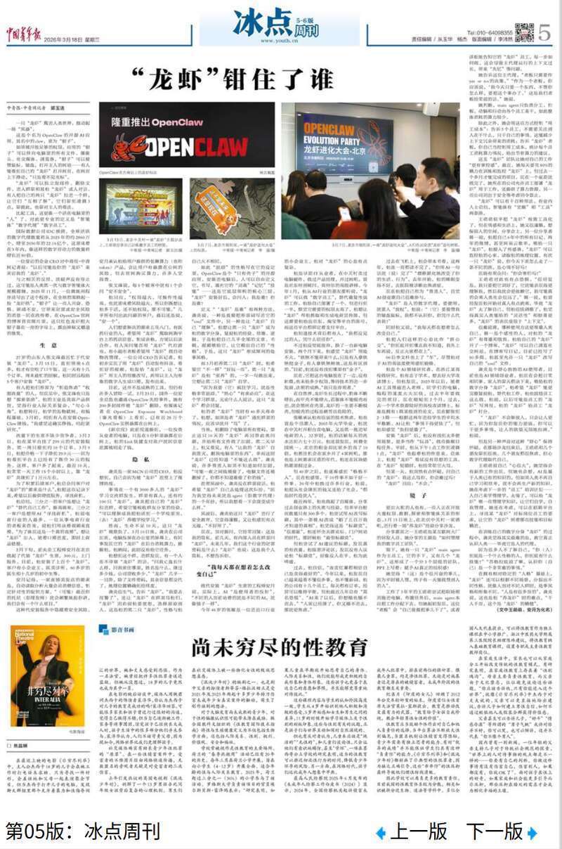 据中国青年报今日5版,一只“龙虾”爬进人类世界,搅动起一场“风暴”。一位受访的企业CEO对中青报·中青网记者说:“以后可能是你的‘龙虾’来采访我的‘龙虾’。”详情